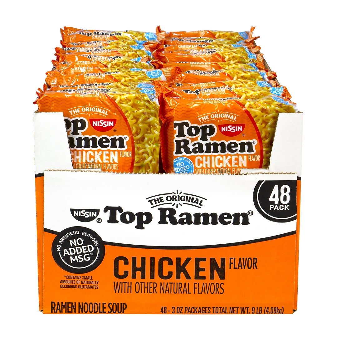 10.7% 55.6% 33.7% protein total carbohydrate total fat 380 cal. Nissin top ramen bowl ramen noodle soup, beef, 3.28 ounce (pack of 6) 6 count (pack of 1) 4.4 out of 5 stars 99. In 1972, our gardena, ca, plant started production of top ramen—the first instant ramen manufactured and sold in the u.s. The nissin top ramen, chicken flavor packets are also excellent for resale in vending machines, college dorm canteens or convenience stores. Order bulk online by case, pallet or truckload quantity.